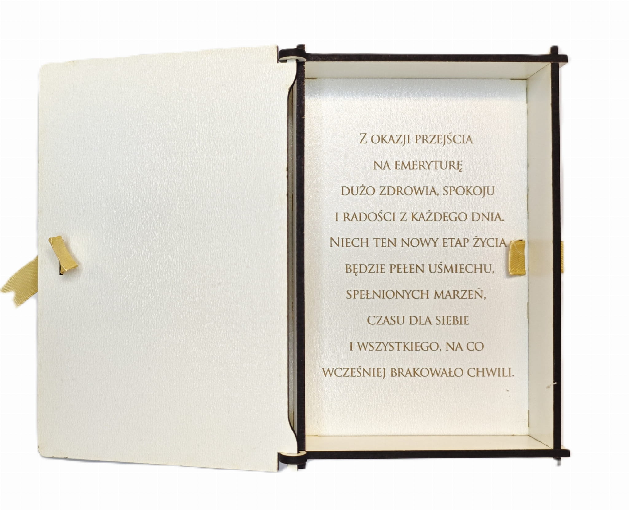 Już od pierwszego spojrzenia zachwyca swoją elegancją. Połączenie subtelnej bieli ze złotymi, lustrzanymi napisami tworzy efekt luksusu, który przyciąga wzrok i podkreśla rangę okazji. Delikatna, satynowa wstążka dodaje całości klasy, a staranne wykonanie sprawia, że pudełko aż chce się wziąć do ręki – gładka powierzchnia i dopracowane detale budują wrażenie produktu premium.