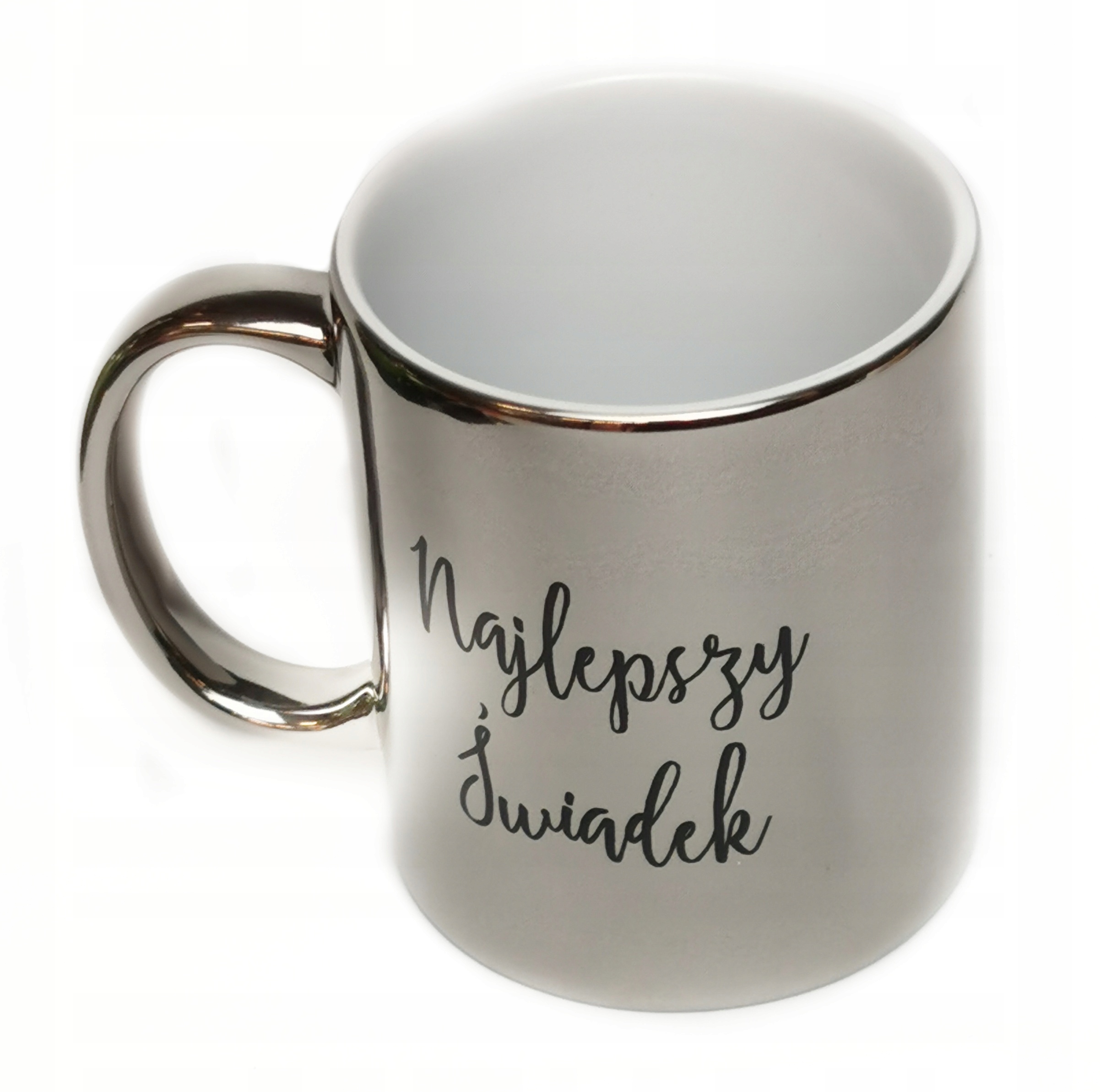 Mamy świetną propozycję. Piękny srebrny lustrzany kubeczek z unikatową dedykacją . Wyjątkowości dodaje mu napis NAJLEPSZY ŚWIADEK w kolorze czarnym,
