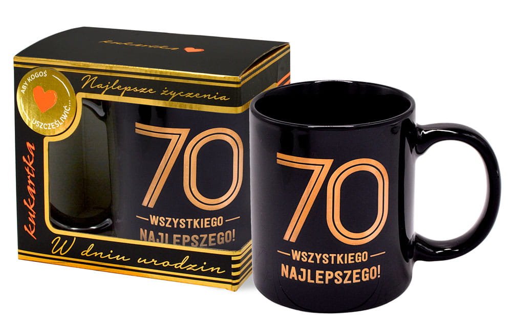 Czarno-złota kolorystyka natychmiast przyciąga wzrok i kojarzy się z luksusem oraz klasą. Złocony napis „70 – Wszystkiego Najlepszego!” pięknie odbija światło, nadając kubkowi prestiżowy charakter. Gładka, porcelanowa powierzchnia jest przyjemna w dotyku, a solidny uchwyt sprawia, że kubek idealnie leży w dłoni – zarówno podczas porannej kawy, jak i wieczornej herbaty. Kubek ten łączy w sobie elegancję i funkcjonalność.