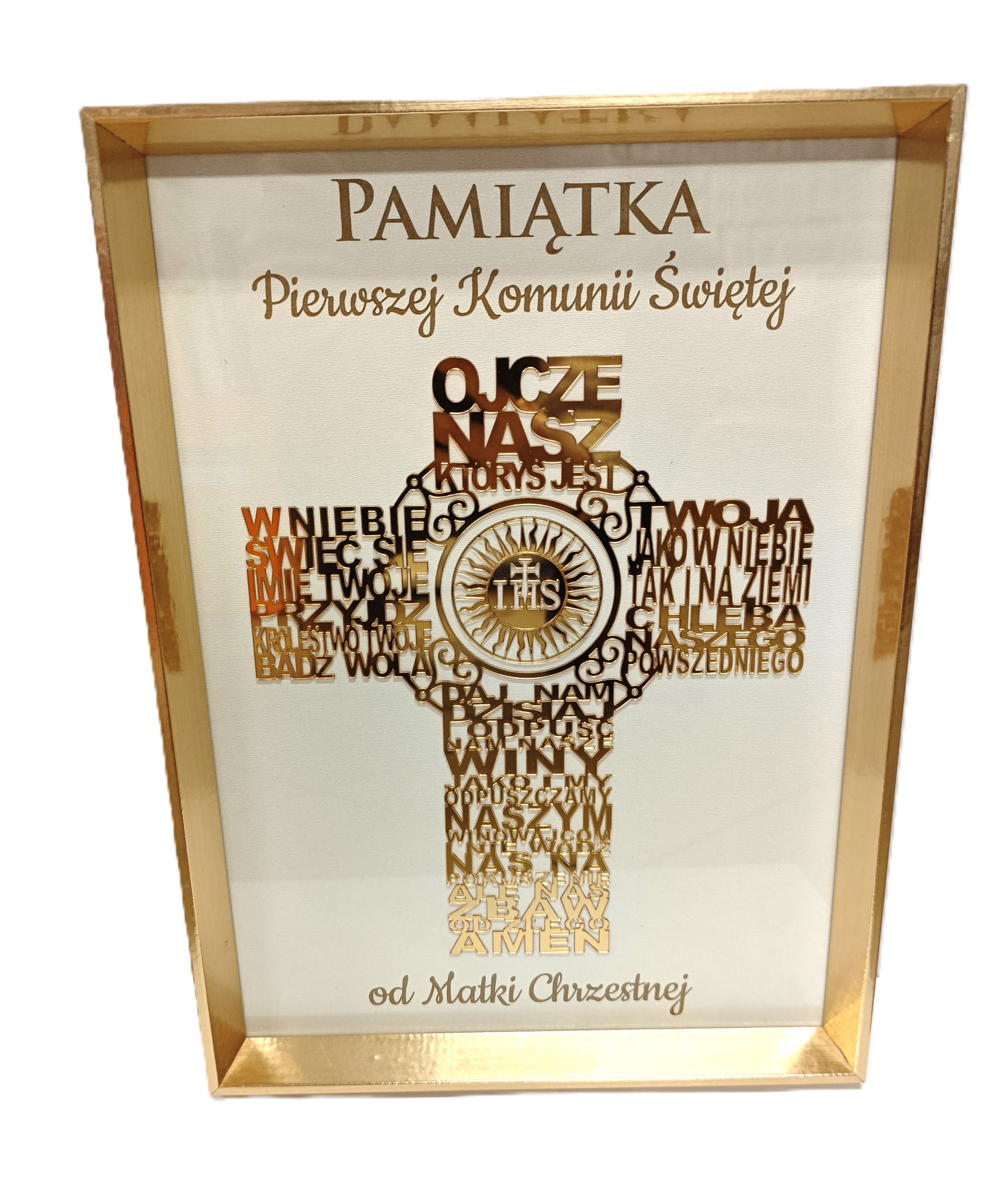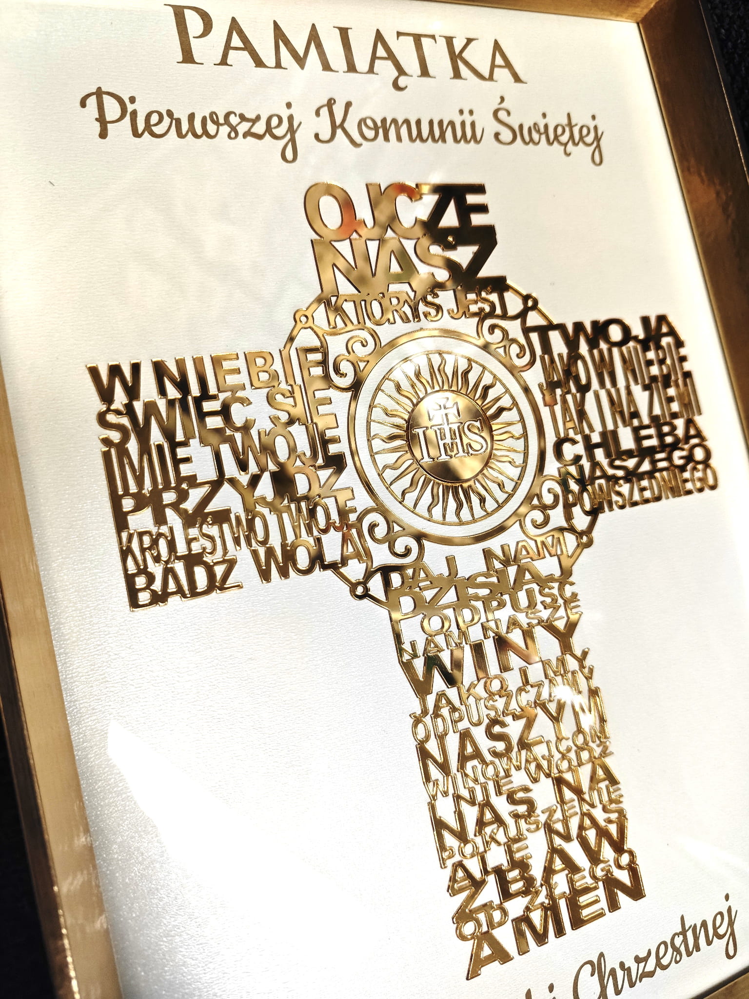 Elegancka złota ramka Pamiątka I Komunii Świętej – krzyż z modlitwą Ojcze Nasz - wyjątkowy obraz 3D prezent dla dziecka na całe życie!
