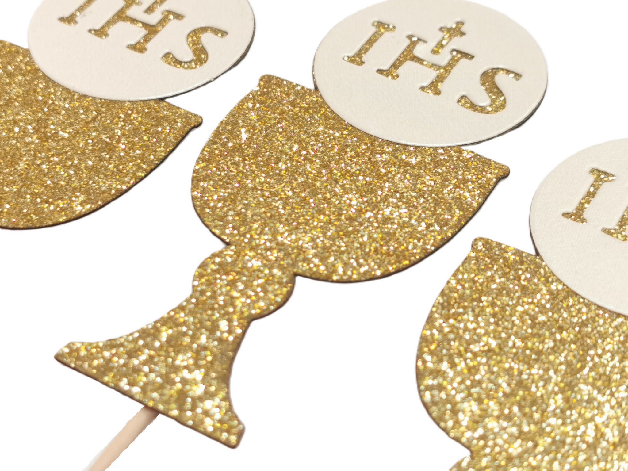 Wielkość ok 9x4 cm. Podana cena dotyczy 3 sztuk kielichów na patyczkach. Gotowe do wbicia w ciasto na komunię. Toppery jednostronne, tył biały