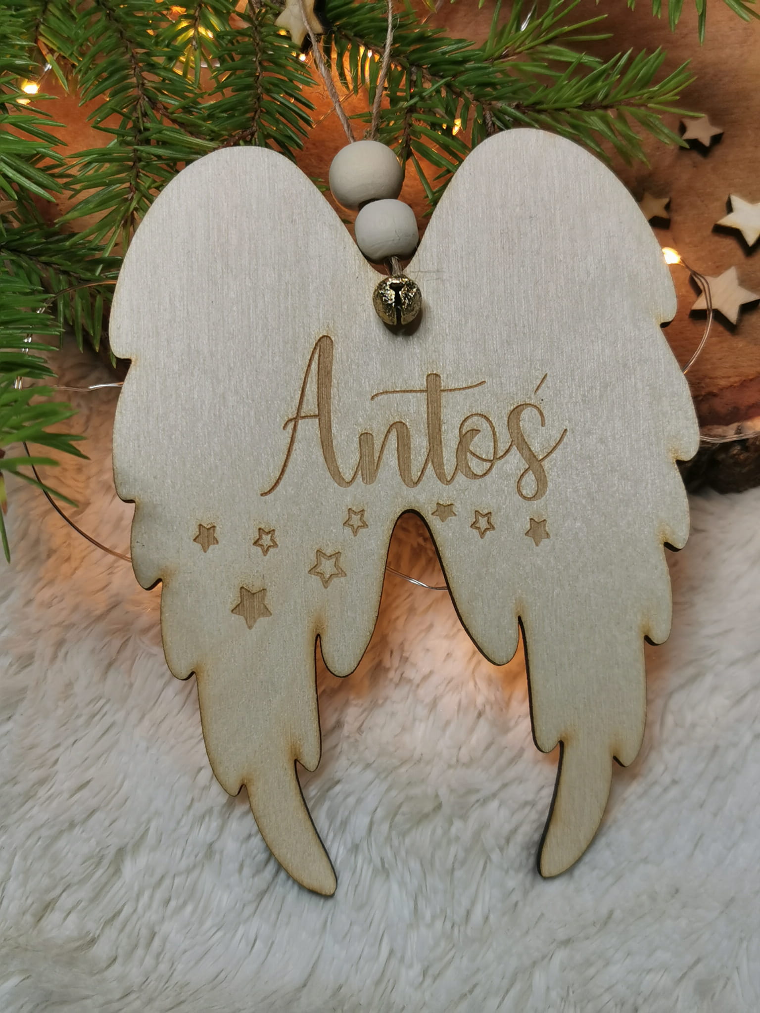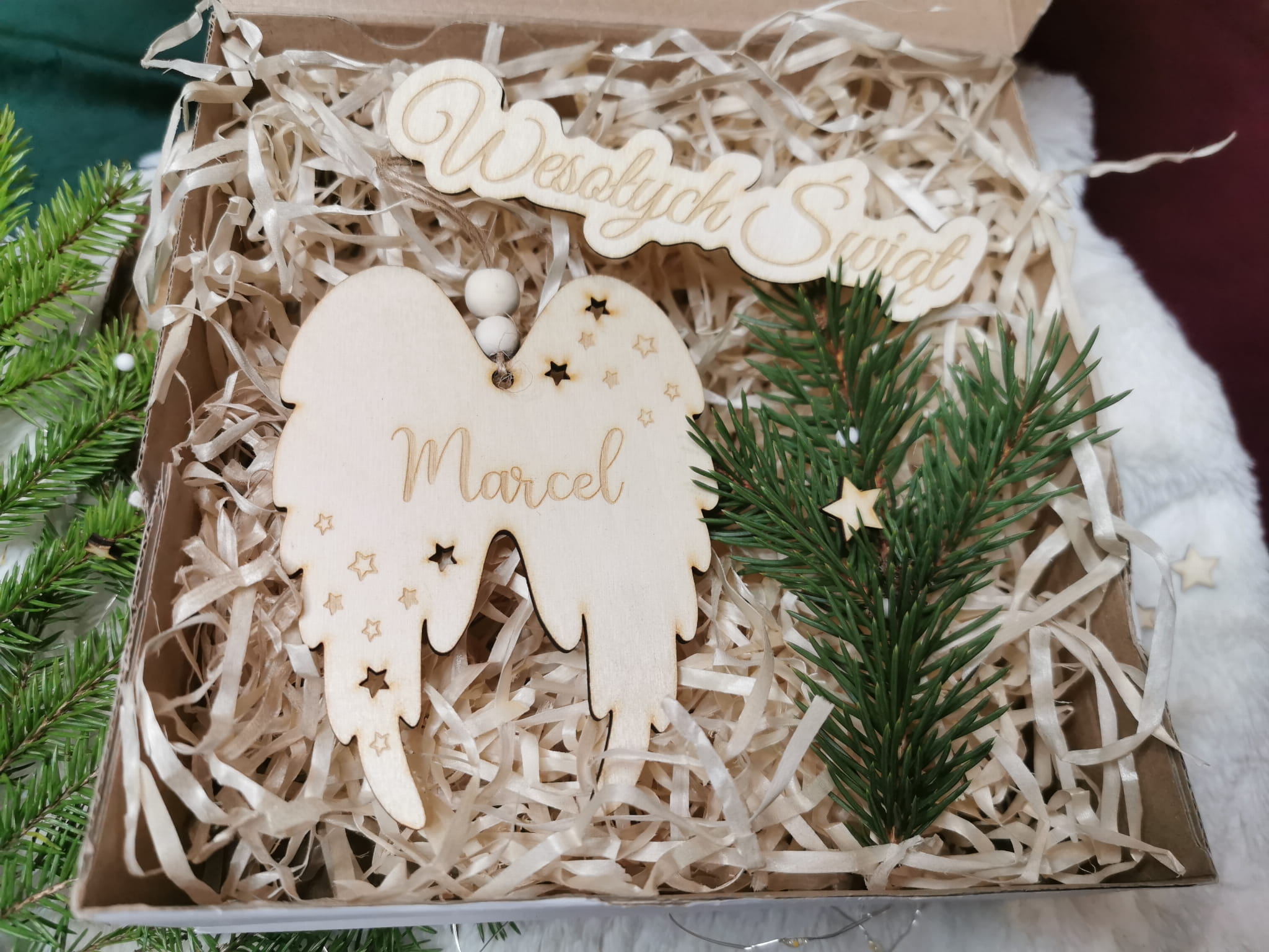 - Drewniana zawieszka w kształcie SKRZYDEŁ ANIOŁA Z GRAWEROWANYM IMIENIEM stanowi wspaniałą i niepowtarzalną świąteczną ozdobę.
